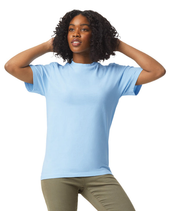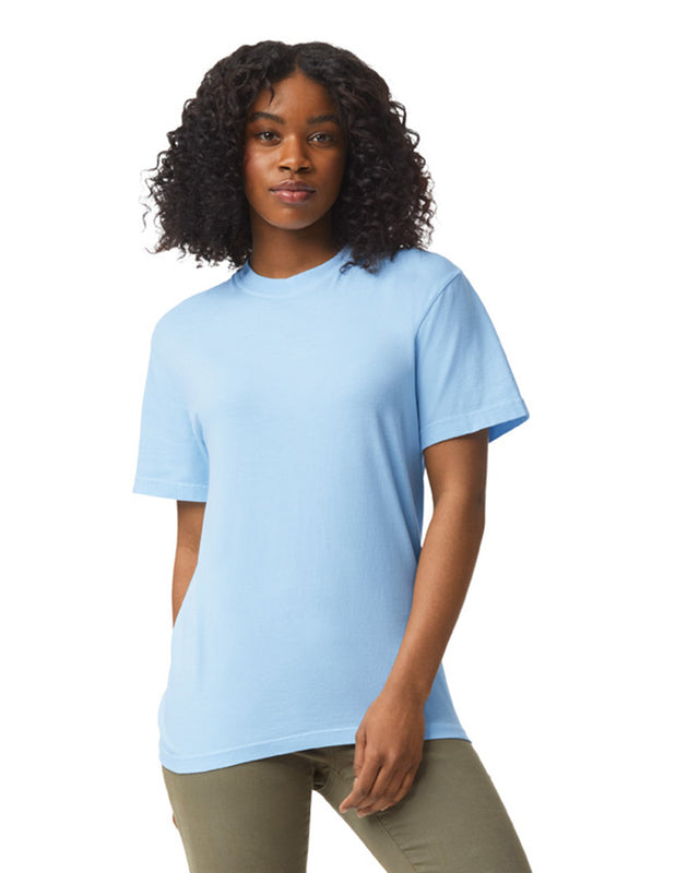 Soft ring-spun cotton fabric tee with 100% cotton threads. Relaxed fit with topstitched, classic width rib collar.