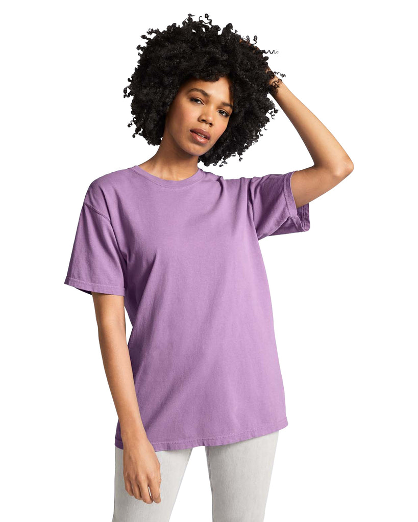Soft ring-spun cotton fabric tee with 100% cotton threads. Relaxed fit with topstitched, classic width rib collar.