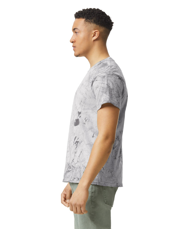 Garment-dyed soft ring spun color blast fabric tee with 100% cotton threads. Relaxed fit with topstitched, classic width rib collar.