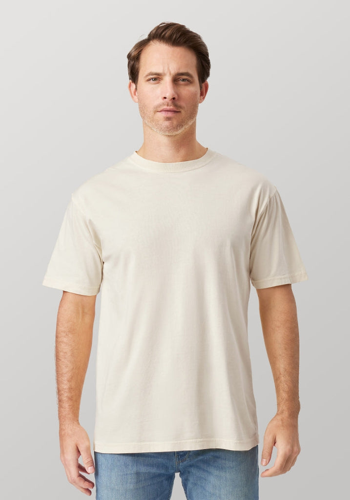 25 single, 5.5 oz 100% ring-spun cotton. Garment dyed.