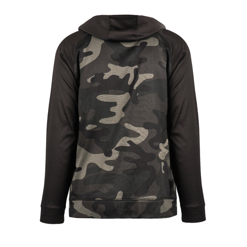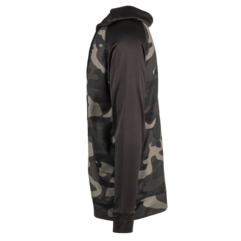 6 oz. 100% polyester performance hoodieRaglan sleevesFront pouch pocketsOverlock stitching detailHemmed bottom & cuffsBlack draw cordNylon zipperSizes: S-3XL