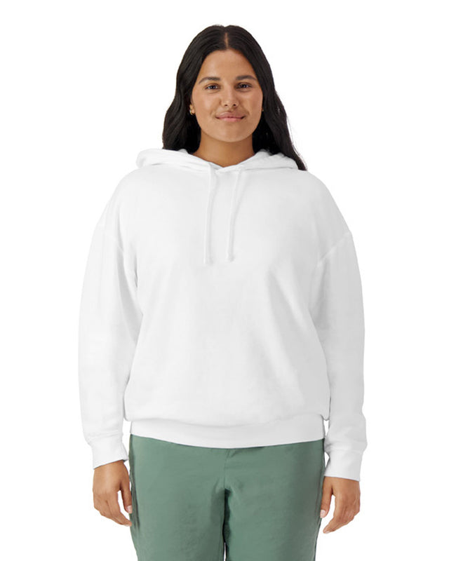 Relaxed fit, soft ring spun cotton fabric hoodie with 100% cotton threads. Jersey lined hood with natural colored flat cord, white flat cord on color white.